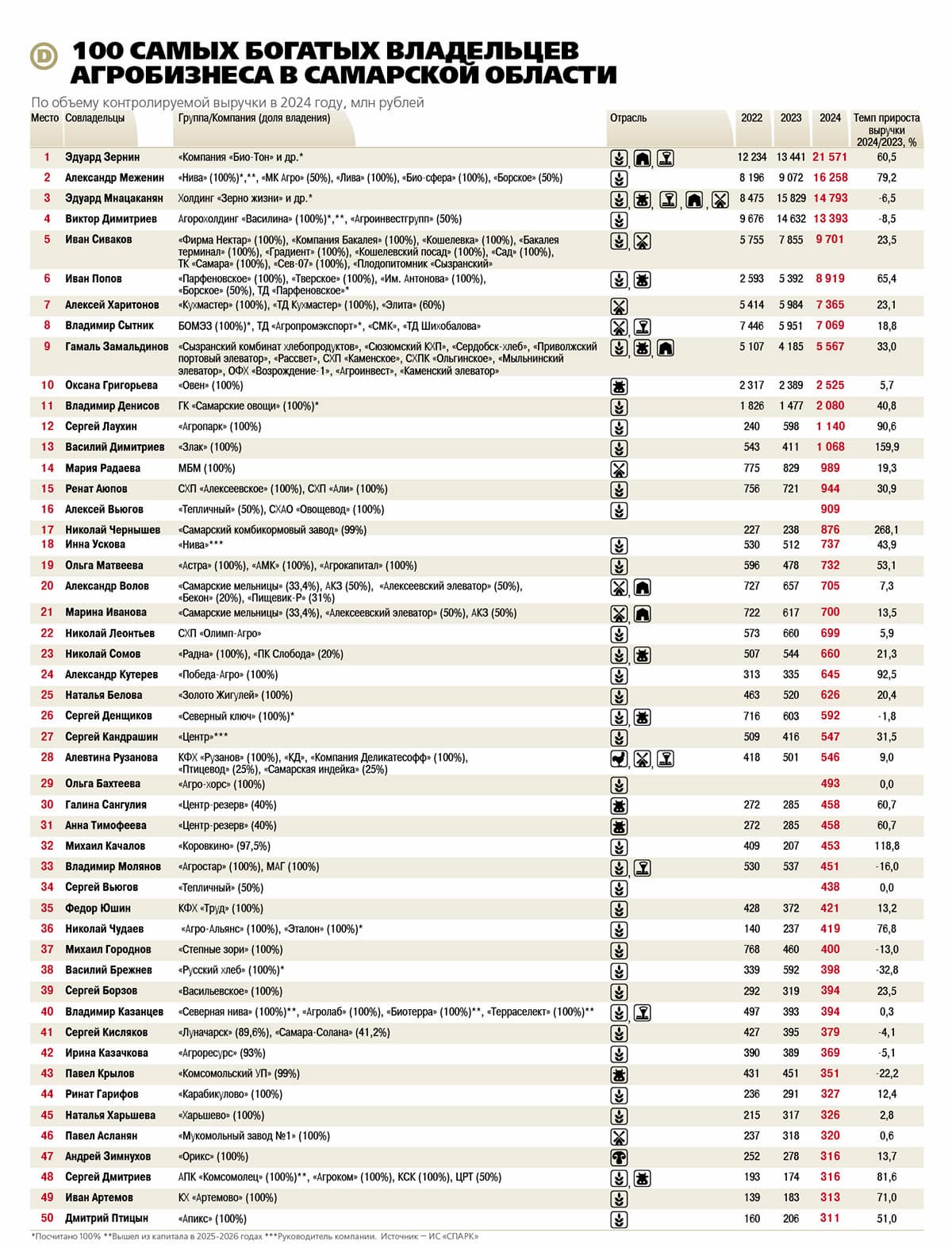 Рост обеспечили как показатели флагманских предприятий группы, например, выручка «Компании «Био-Тон» увеличилась на треть, с 10,2 до 15,2 млрд рублей, так и консолидация активов других предпринимателей. Так, в 2024 году частью холдинга стали компании другого известного регионального агрария — Виктора Димитриева. Из группы в группу перешли «Конезавод «Самарский» и связанный с ним «Серноводский элеватор». Соответственно, в новом рейтинге «ДЕЛА» показатели этих компаний впервые отправились «в зачет» Зернина.