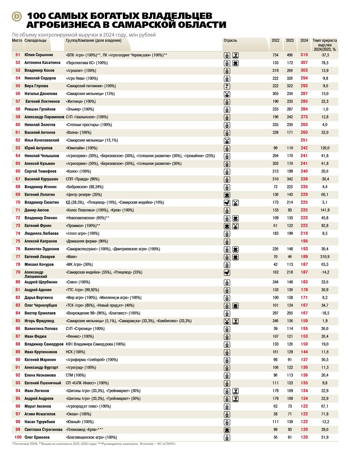 Покинет рейтинг «ДЕЛА» и основной владелец агрофирмы «Новопавловская» Владимир Оленин. С долей 60% и выручкой 223 млн он занял 72-е место. Совладельцами компании выступают Елена Захарова и Алексей Мокшин (по 20%). Полная выручка компании составляет 370,9 млн, а прибыль 24 млн рублей. Впрочем, в 2025 году Оленин покинул компанию. Его место занял Александр Грибеник, бывший глава Большеглушицкого района.