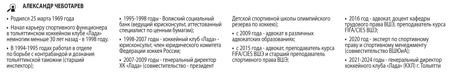 Проработав юрисконсультом ХК «Лада» и в юридическом комитете Федерации хоккея России, в дальнейшем он провел два срока на посту генерального директора «Лады» — сначала в 2007-2009 годах, а затем вновь в 2021-2024 годах. На момент назначения Чеботарева гендиректором в апреле 2021 года «Лада» занимала 18-е место в Высшей хоккейной лиге. Последующие два сезона тольяттинцы стабильно выходили в финальную часть ВХЛ, улучшая показатели. В сентябре 2023 года «Лада» взорвала медиапространство своим возвращением в элиту российского хоккея — Континентальную хоккейную лигу. А успешное выступление в дебютном сезоне после пятилетнего отсутствия заставило замолчать даже ярых скептиков, утверждавших, что тольяттинцы еще не готовы к КХЛ. Насколько изменился региональный хоккей за последние 30 лет? Как менялась модель поддержки хоккейных клубов в регионе? Чем отличался ХК «Лада» от других клубов российской хоккейной элиты в начале 2000-х? Об этом экс-генеральный директор ХК «Лада», профессор НИУ ВШЭ, доцент, кандидат юридических наук, адвокат Александр Чеботарев рассказал в интервью «СО». Это интервью стало частью цикла публикаций, связанных с юбилеем газеты «Самарское обозрение», отслеживавшей в том числе и развитие регионального спорта высших достижений с момента своего появления на рынке в 1996 году.