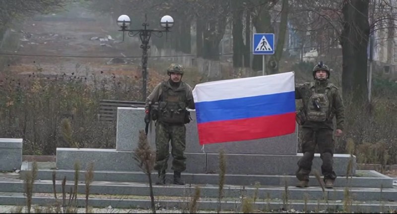 На видеокадрах опубликованных Минобороны РФ, российские военнослужащие свободно передвигаются по городу и разворачивают флаг России на площади Шибанкова напротив Красноармейского индустриального института Донецкого национального технического университета.