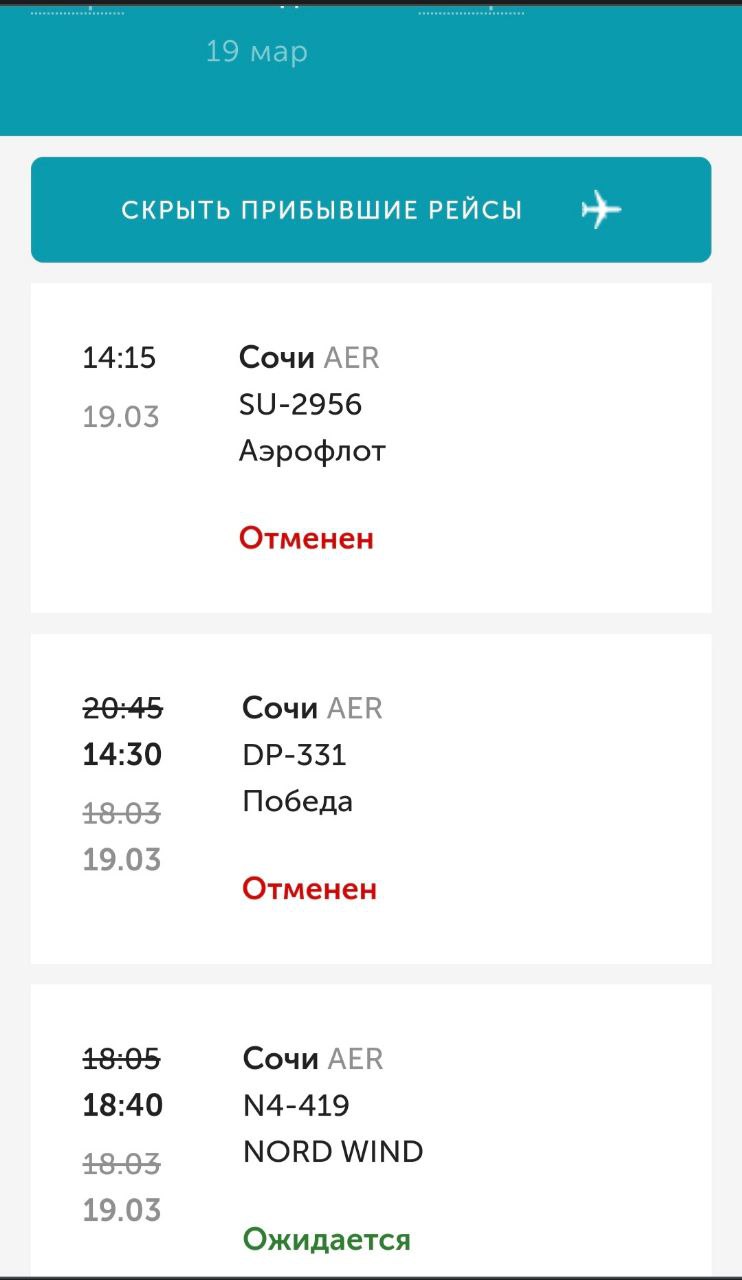 Не смогут 19 марта прилететь в Самару из Сочи пассажиры рейсов авиакомпании «Победа» DP-331, который должен был привезти их в Самару еще 18 марта в 20:45 и «Аэрофлот».