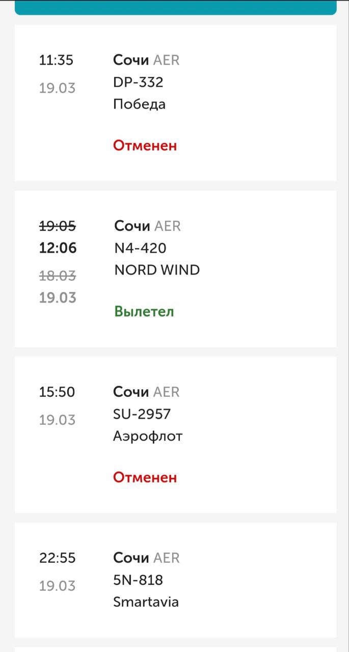 Все еще ожидаются к прилету рейсы из Сочи авиакомпаний: «Победа» в 18:40, Smartavia в 22:15, Nord Wind в 22:30.