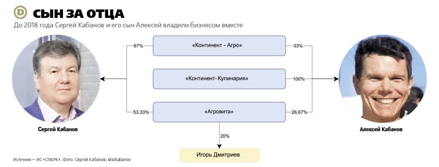 Алексею Кабанову в «Агровите» принадлежало 26,67%, его отцу — 53,33%, оставшиеся 20% получил менеджер Кабановых Игорь Дмитриев. Он был руководителем зарегистрированной в 2011 году на Алексея Кабанова фирмы «Континент-Кулинария».