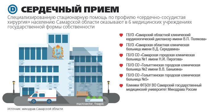 В специализированных учреждениях Самарской области по профилю «сердечно-сосудистая хирургия» оказывают все виды помощи по разделу «кардиохирургия» (коронарное шунтирование, лечение больных с приобретенными и врожденными пороками сердца, больным с нарушениями ритма сердца (тахикардии, брадикардии), стентирование коронарных артерий сердца, артерий, питающих головной мозг, верхние и нижние конечности).