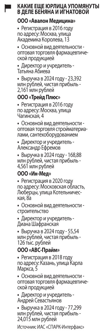 В материалах дела Беняна и Игнатовой также упоминаются ООО «Авалон Медицина», ООО «Трейд Плюс», ООО «Ин-Мед» и ООО «АВС-Прайм». Из них на территории Самарской области работала только фирма «Ин-Мед» Дианы Шафранской. В ее контрактном портфеле — 162 контракта на 287,9 млн рублей. В Самарской области заказчиками ООО «Ин-Мед» были Самарская горбольница №8, областная больница имени Середавина, Тольяттинская городская клиническая больница №5, Самарский областной онкодиспансер, Самарская областная детская больница имени Ивановой. Предметом поставок почти везде были расходники, реагенты и некие медизделия. «Ин-Мед», в отличие от фирм Изюмского, заключала контракты в Самарской области и в 2025-м, и в 2026 годах. Юрлицо также много работало в Республике Марий Эл, как и ООО «АВС-Прайм».
