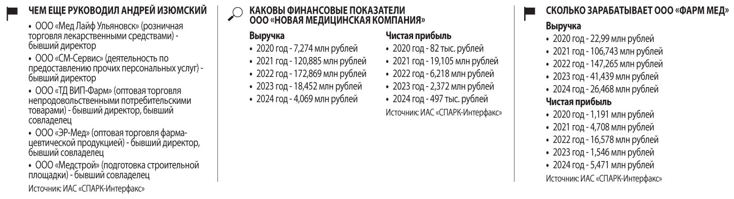 И «Фарм Мед», и НМК — пока еще действующие компании, но в отсутствие подрядов их ликвидация лишь вопрос времени. Кроме того, Самарский областной суд с апреля 2024 года с частотой примерно раз в 2-3 месяца рассматривал некие апелляционные жалобы Андрея Изюмского — не исключено, что оспаривалась мера пресечения. В условиях уголовного преследования (а возможно, и ареста) деловая активность бывшего топ-менеджера ООО «Мед Лайф Ульяновск» по вполне понятным причинам резко снизилась.