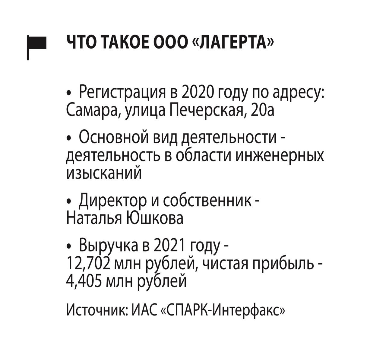 Компания «Лагерта», упоминаемая в новом деле Виктора Федоренчика, зарегистрирована в 2020 году в Самаре и специализируется на инженерных изысканиях. Директором и собственником фирмы является Наталья Юшкова. Финансовые показатели «Лагерты» не впечатляют, но за время своего существования фирма успела освоить 61 госконтракт. В первую очередь — на проведение ремонта. Тут заказчиками фирмы Юшковой были чапаевское МБУ «Управление ЖКХ», Самарская областная детская клиническая больница, Средневолжское ЛУ МВД России на транспорте. С января 2021 года «Лагерта» плотно сотрудничает с ДУИ Самары, прежде всего в плане ремонта жилых помещений, находящихся в муниципальной собственности. Это квартиры в доме №59 на Заводском шоссе, в доме №28 на улице Балаковской, в доме №270 на улице Самарской, в доме №53 на бульваре Ивана Финютина, в доме №155 на Зубчаниновском шоссе, в доме №2/65 в Шариковом переулке. А с февраля по апрель 2021 года фирма Юшковой активно работала в поселке Озерный: по договору с ДУИ «Лагерта» отремонтировала здесь 107 квартир.