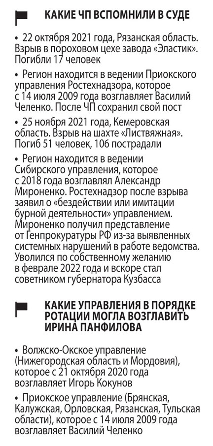 Среди истребованных судом материалов фигурируют и методики оценки работы территориальных подразделений. По ним Средне-Поволжское управление в 2021 году оказалось лучшим в РФ, и истец несколько раз ставил вопрос: почему тогда Ирина Панфилова была уволена, а другие руководители, имеющие взыскания и с худшими результатами, остались? Почему не увольняли тех, у кого на территории гибли люди в чрезвычайных ситуациях на опасных производствах (в частности, были названы прошлогодние взрывы на шахтах в Кузбассе и пороховом заводе в Рязанской области)?