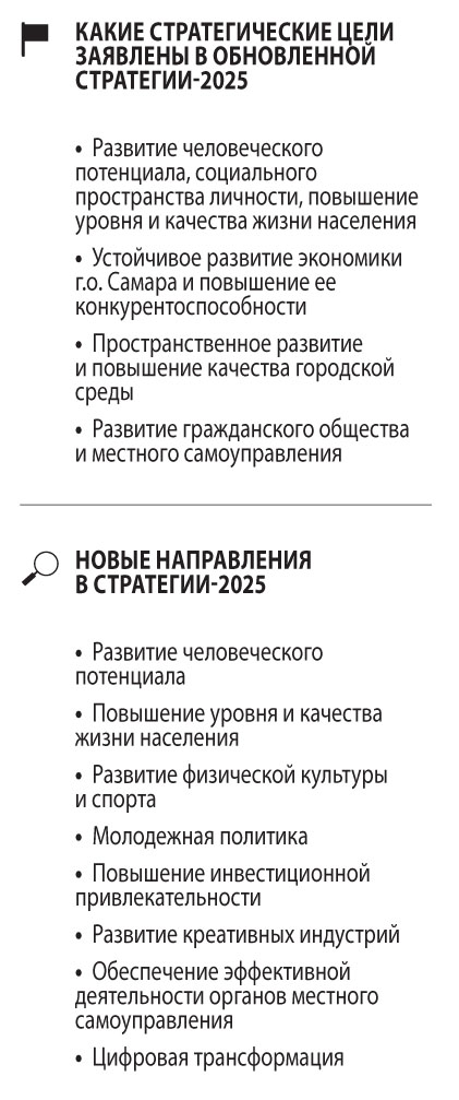 Новыми направлениями в обновленной стратегии стали — развитие человеческого потенциала и социального пространства личности, повышение уровня и качества жизни населения, повышение инвестиционной привлекательности, развитие креативных индустрий, обеспечение эффективной деятельности органов местного самоуправления, а также цифровая трансформация. По словам председателя думы г.о. Самара Алексея Дегтева, главный принцип стратегии — сделать проживание в Самаре максимально качественным. «Благодаря подобным программным документам мы получаем ответы на вопросы: куда мы идем и каким хотим видеть наш город в ближайшей перспективе. Строительство дорог и социальных объектов, эффективная логистика городских пассажирских маршрутов, доступность города для людей с ограниченными возможностями здоровья — документ учитывает интересы жителей, поэтому в нем нашли отражение все проекты и планы, цель которых — сделать жизнь горожан максимально комфортной», — подчеркнул Алексей Дегтев.