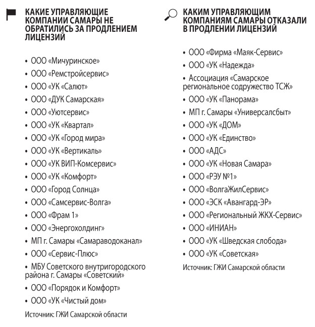 Как пояснили «СО» в ГЖИ Самарской области, в общей сложности срок действия лицензий в итоге не продлили примерно 1/10 городских управляющий компаний — 35 организациям. Из них 16 было отказано в соответствующей просьбе, а 19 с заявлениями в лицензирующий орган вовсе не обращались. Под управлением этих УК до 1 июня находился 841 многоквартирный дом. Дальнейшая судьба уходящих с рынка компаний неизвестна. Но зачастую такие УК прекращают работу и ликвидируются. Это может быть чревато неприятными последствиями как для жильцов, так и для ресурсоснабжающих организаций. Собственники квартир могут на время лишиться обслуживания дома, а ресурсоснабжающие организации, в свою очередь, могут не получить оплату за поставленные ресурсы.
