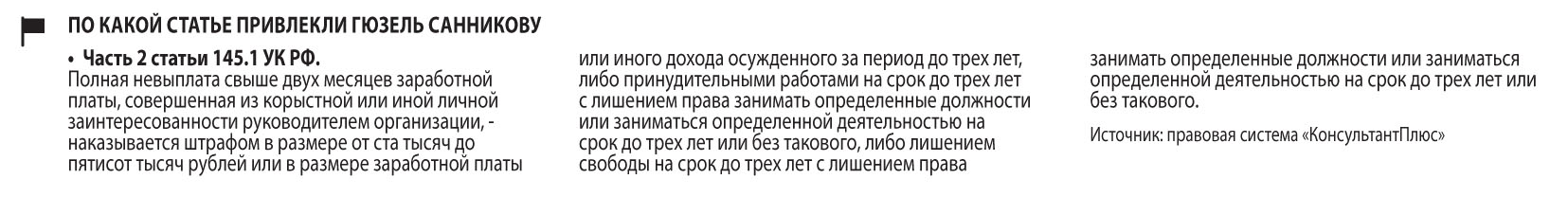 В мае 2022 года скандал с невыплатой зарплаты продолжился: подчиненные Санниковой пришли на прием к руководителю СУ СКР по Самарской области Марату Галиханову. На тот момент ведомством уже расследовалось уголовное дело, которое Галиханов взял на личный контроль. Гюзели Санниковой предъявили обвинение по части 2 статьи 145.1 УК РФ (полная невыплата свыше двух месяцев заработной платы). Санкция статьи — до 3 лет лишения свободы.
