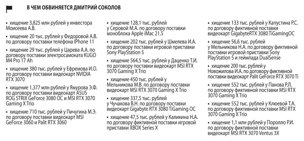Соколов размещал на интернет-площадках объявления о продаже популярных товаров: смартфонов, игровых приставок, видеокарт, майнинг-ферм по существенно заниженной цене. Покупателям посылались сфальсифицированные документы о мнимой закупке товаров, а деньги от заказов похищались. Среди фиктивных заказов, которые оформлял Соколов, было много айфонов и другой техники Apple, но когда в моду вошел майнинг криптовалют, мошенник начал «кидать» заказчиков на видеокарты, из которых собираются майнинговые фермы. Так, потерпевший Ямуров потерял в пирамиде Соколова 1,377 млн рублей — деньги перечислялись мошеннику на покупку видеокарт ASUS ROG STRIX GeForce 3080 OC и MSI RTX 3070 Gaming X Trio. Потерпевший Пичугин хотел приобрести видеокарты MSI GeForce 3060 и Palit RTX 3060 и лишился 710 тыс. рублей. «С целью заработка денежных средств я выделил для себя нишу бизнеса по перепродаже видеокарт, которые служат инструментом для заработка криптовалюты, так как на то время ее стоимость ежедневно росла, соответственно, стоимость видеокарт увеличивалась и рос мой доход», — рассказывал Соколов на следствии. На деле же после оформления договора и перечисления денег клиенты с изумлением наблюдали, что контактные телефоны продавца выключены, а сам он куда-то пропал. В общем, все по классике.