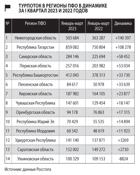 Более показательным в этом случае может быть анализ турпотока в регионы ПФО в динамике за I квартал 2023 и 2022 годов на основе данных Росстата. Согласно опубликованным на сайте данным (см. инфографику), наилучшую динамику показали Нижегородская область (+140 397), Республика Татарстан (+108 278) и Самарская область (+58 452).