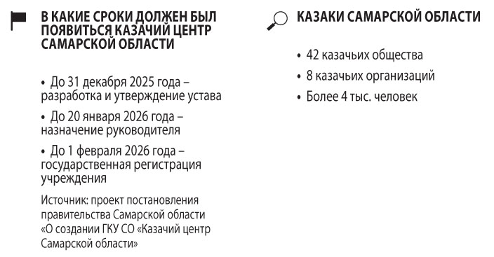 Документы о создании ГКУ «Казачий центр Самарской области» опубликованы на сайте «Белого дома» в ноябре 2025 года в разделе «Антикоррупционная экспертиза». Основной целью его деятельности заявлены организация и обеспечение комплекса мер, способствующих развитию, поддержке и сохранению традиционных ценностей российского казачества на территории губернии. От лица Самарской области функции и полномочия учредителей ГКУ предполагалось возложить на два министерства — внутренней политики и имущественных отношений. Согласно дорожной карте по созданию госучреждения, до конца 2025 года необходимо было разработать и утвердить его устав, а до 20 января 2026-го — назначить руководителя. Также в срок до 1 февраля планировалось пройти государственную регистрацию, а затем в течение десяти дней — разработать и утвердить бюджетную смету. По этим же планам казачий центр должен заработать уже весной 2026-го. Предельная штатная численность учреждения при этом была определена в объеме не 23, а 32 единицы.