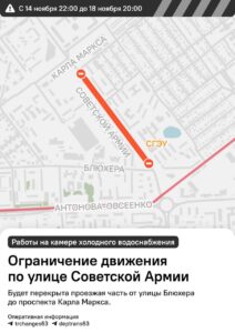 На улице Советской Армии в Самаре с 10 вечера пятницы, 14 ноября, будет полностью перекрыто движение транспорта. Ограничения связаны с аварийно-восстановительными работами на камере холодного водоснабжения, которые продлятся до вечера (20:00) вторника, 18 ноября.