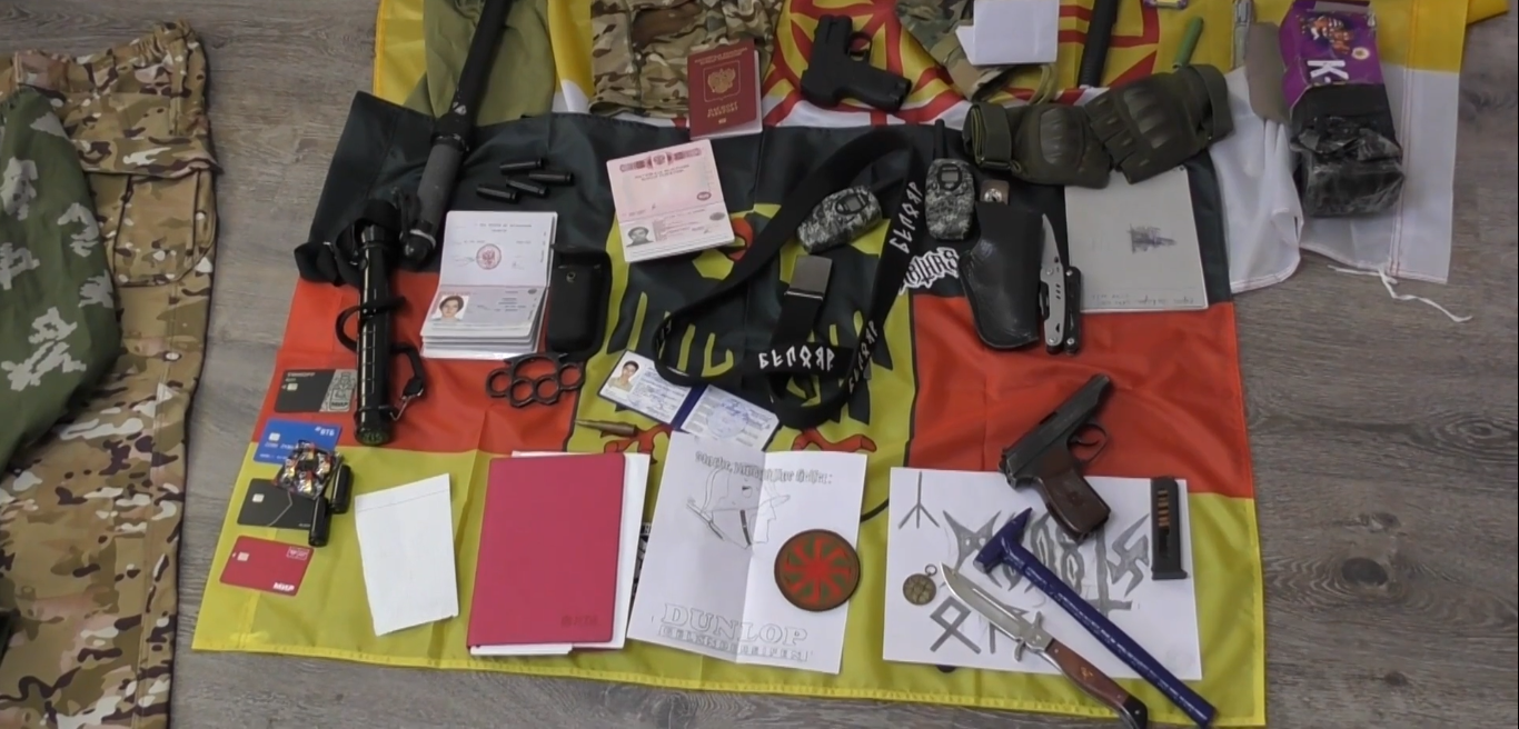В ходе обысков у задержанных и уничтоженного главаря изъято самодельное взрывное устройство массой один килограмм, граната Ф-1, пистолет Макарова с приспособлением для бесшумной стрельбы, два газовых пистолета, рации, а также неонацистская атрибутика и символика украинских военизированных формирований. Кроме того, обнаружена «инструкция по вступлению в состав запрещенной в Российской Федерации украинской террористической организации».