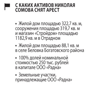 В ходе рассмотрения дела по заявлению налоговой службы были наложены аресты на имущество Николая Сомова в виде домов и земельных участков в Отрадном и Беловке, а также запрет распоряжения 100% долей ООО «Радна», выручка которого по итогам прошлого года составила порядка 659 млн рублей.