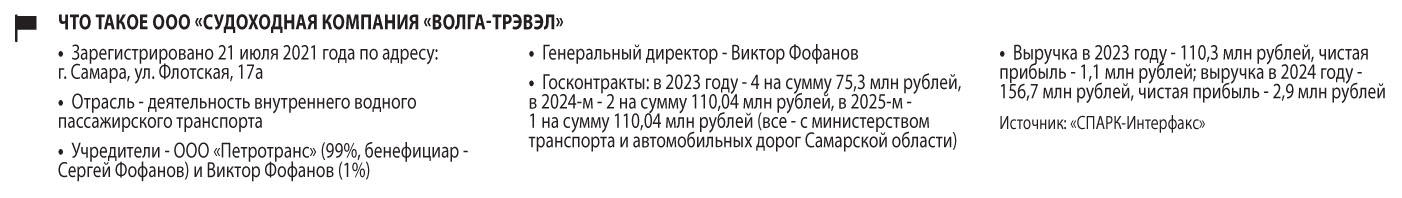 В Самарской области на направлении водных пассажирских перевозок, по сути, доминирует одна судоходная компания — ООО «СК «Волга-Трэвэл», которой владеет (через ООО «Петротранс») известный бизнесмен Сергей Фофанов, а руководит его сын Виктор Фофанов. Созданная летом 2021 года, «Волга-Трэвэл» практически сразу стала получать от областных властей контракты на речные перевозки пассажиров, используя для этого скоростные суда на подводных крыльях класса «Валдай». Львиная доля оборотов компании складывается именно из этих подрядов. Так, в 2023 году она получила их на сумму 75,3 млн рублей (выручка за тот же год составила 110,3 млн), в 2024-м — на 110 млн (при выручке в 156,7 млн).