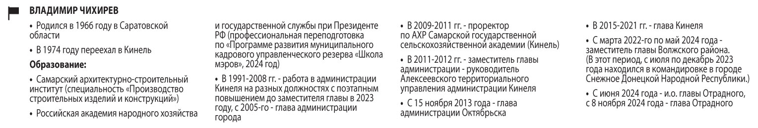 Владимир Чихирев подходит на эту роль, так как его карьера в основном связана с Кинелем, в котором он жил с детства и работал до 47 лет, через два года вернулся и еще шесть лет был главой Кинеля. Помимо этого, мэр Отрадного руководил Октябрьском и работал замглавы Волжского района. В 2023 году находился в командировке в ДНР в городе Снежное. А в прошлом году глава Отрадного прошел профессиональную переподготовку в РАНХиГС по программе «Школа мэров», что, очевидно, может говорить о его карьерных амбициях и планах развиваться.