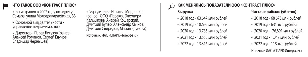 Компания «Контраст Плюс», засветившаяся в деле Драча и Кудряшова, зарегистрирована в 2002 году по тому самому роковому адресу: Самара, улица Молодогвардейская, 33. Юрлицо специализируется на операциях с недвижимостью. Руководит фирмой Павел Бутузов, ранее директором был Алексей Романов. Собственник ООО — Наталья Мордовина. С 2016 года компания заключила 17 госконтрактов на сумму более 155 млн рублей. Все они связаны с арендой помещений на улице Молодогвардейской, 33. Последний контракт на 2,346 млн рублей заключен в декабре 2022 года и, по данным ИАС «СПАРК-Интерфакс», в настоящее время исполняется.