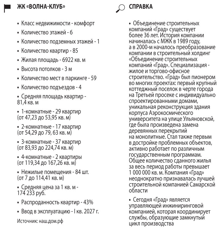 Жилой комплекс расположен в центре Самары, в границах исторического поселения, что в условиях фактического моратория на девелоперскую деятельность внутри ИП вводит его в число самых интересных объектов жилищного строительства в областной столице. Мало того — от дома до Волги всего несколько десятков метров. Сейчас работы в третьей секции идут на уровне первого этажа, а первая и вторая секции построены полностью, начаты фасадные и внутренние работы. Ввод в строй ЖК запланирован уже на 31 марта 2027 года. Реализация проекта стала логичным продолжением многолетней деятельности ГК «Град» по строительству зданий, гармонично вписывающихся в историческую среду областной столицы.