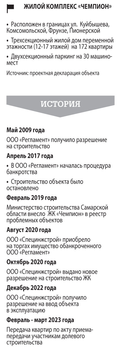 Спустя год чиновникам все же удалось привлечь для завершения строительства «Чемпиона» инвестора — группу «Новый Дон». Предприятия холдинга уже участвовали в достройке проблемных объектов в Самаре.