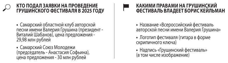 Между тем постоянный организатор Грушинского последних лет — клуб Бориса Кейльмана — заявку на субсидию не подал, а его представители публично выразили свое несогласие с тем, что «в первые выходные июля кто-то готовит фестиваль авторской песни». «Если фестиваль в указанные даты на Грушинской поляне состоится, мы просим не называть его Грушинским», — заявила команда Кейльмана. Свое несогласие они аргументировали тем, что товарные знаки, необходимые для проведения фестиваля, включая название и символику, принадлежат исключительно Грушинскому клубу. Исполнительный директор клуба и дочь Бориса Кейльмана Мария Кейльман в беседе с «СО» подтвердила, что их позиция как владельцев прав на фестиваль не поменялась.