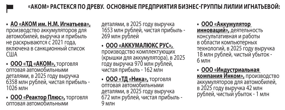 Флагман аккумуляторного холдинга — АО «АКОМ им. Н.М. Игнатьева», на котором собраны производственные мощности. Предприятие работает с 2001 года, производство стартовало с 2002-го. Финансовое состояние компании непрозрачно: выручка и прибыль не раскрываются с 2021 года, то есть после вступления Лилии Игнатьевой в наследство.