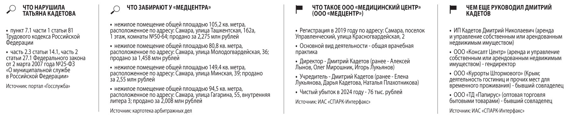 Факт заинтересованности при принятии решения в отношении муниципального имущества, предоставляемого в аренду, и при последующем его отчуждении по преимущественному праву выкупа в пользу близких родственников был подтвержден результатами проверки соблюдения Татьяной Кадетовой ограничений и запретов, установленных законодательством о противодействии коррупции. Прокуратура увидела в действиях чиновницы в пользу фирмы ее сына конфликт интересов и через суд добилась изменения формулировки увольнения Кадетовой на утрату доверия. Сама же чиновница уволилась из мэрии Самары летом 2024 года по собственному желанию, это произошло за несколько месяцев до прокурорских проверок.