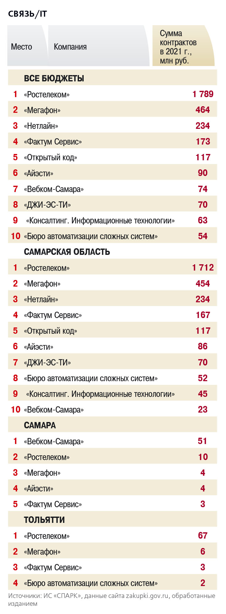 По сути, по итогам 2021 года «Фактум сервис» заняла второе место по объему контрактов на поставки компьютерного оборудования. «Нетлайн» заключил контрактов на 242,5 млн рублей, а «Фактум сервис» на 173,3 млн рублей. При этом по результатам первых шести месяцев нынешнего 2022 года «Фактум сервис» уже лидирует — пока что являясь крупнейшим в сфере IT подрядчиком бюджетов в Самарской области.