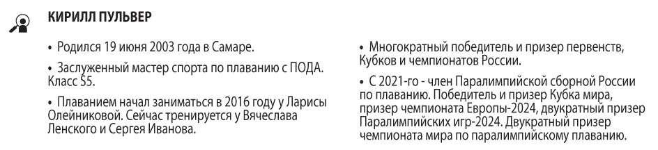 — Небольшая ремарка — чемпионат мира в Сингапуре стал четвертым международным стартом за последние два сезона. Самым «урожайный» выдался чемпионат Европы-2024. В прошлом году я выступал на Кубке мира по плаванию среди инвалидов всех категорий во французском городе Лиможе. Там выиграл 200 метров вольным стилем и стал третьим на «полтиннике» на спине. В Португалии на чемпионате Европы по паралимпийскому плаванию завоевал четыре медали — по два серебра и две бронзы (Пульвер стал вторым на 200 м и 100 м кролем, а также третьим на 50 м на спине и 50 м вольным стилем. — Прим. ред.). Из Парижа с Паралимпиады-2024 привез серебро и бронзу (стал вторым и третьим на 200 и 100 метрах соответственно, обе дистанции кролем. — Прим. ред.).