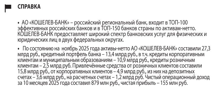 В этих условиях АО «КОШЕЛЕВ-БАНК», наработав экспертизу в работе с МСБ и понимая потребности бизнеса, укрепляет свои рыночные позиции. Как отметил председатель правления АО «КОШЕЛЕВ-БАНК», главное конкурентное преимущество банка – не шаблонная линейка продуктов, а персональный подход. Банк предлагает гибкие условия кредитования без скрытых комиссий и штрафов за досрочное погашение. Процентные ставки по кредитам составляют 20-22% годовых, а многие кредиты выдаются по формуле «ключевая ставка + 2,5-3% годовых». Заявки рассматриваются быстро, в срок до 10 рабочих дней.