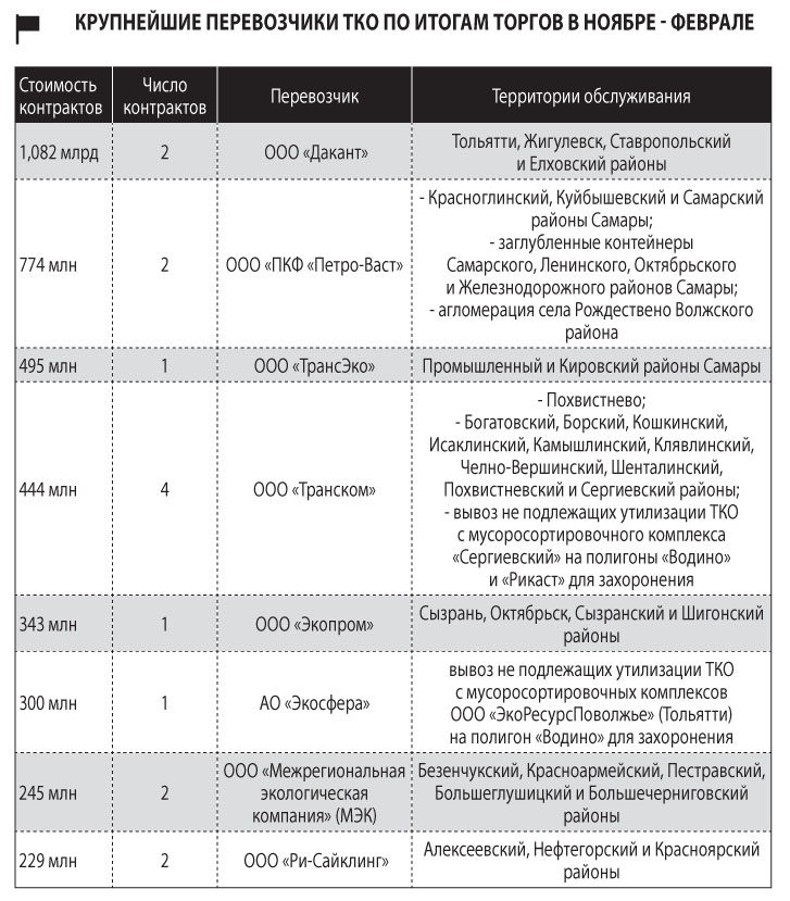 Наиболее крупные перевозчики в основном сохранили за собой территории, на которых работали и до ноября 2024 года. В частности, «Дакант» продолжает возить мусор в Тольятти и Ставропольском районе, только теперь собирает его по всему городу, тогда как прежде Комсомольский район Автограда был для него исключением. По-прежнему транспортирует отходы в Сызрани, Октябрьске и прилегающих районах АО «Экопром». В Новокуйбышевске продолжает работать «Чистый город». В Кировский район Самары после длительного перерыва вернулось ООО «ТрансЭко». В Отрадном и Кинель-Черкасском районе продолжает работать ОО «СБС».