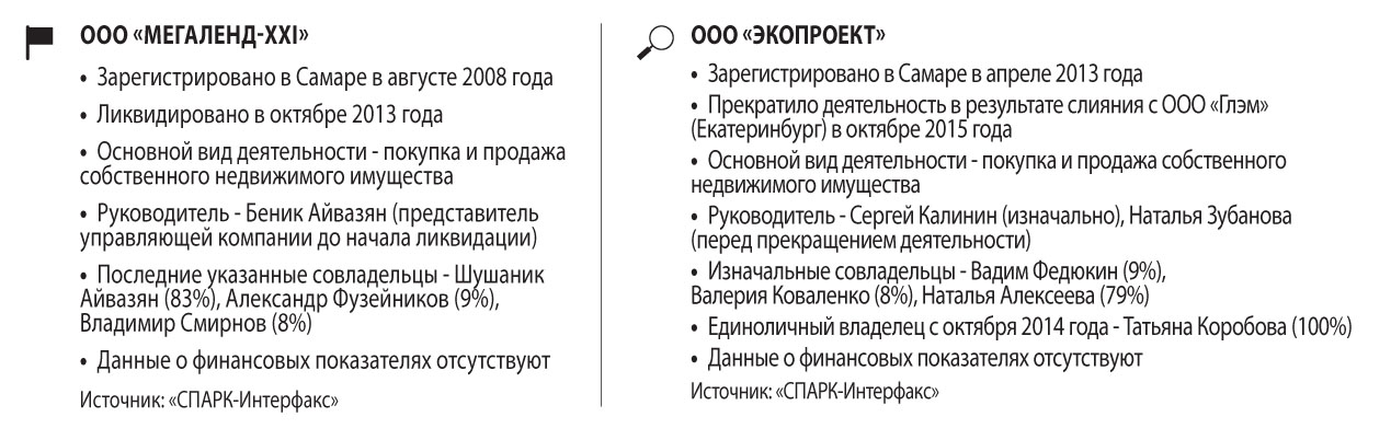 Эту информацию частично подтверждают данные из Единого государственного реестра недвижимости (Росреестра). Согласно ему, самый большой из участков «Лагуны» в марте 2013 года АССПО продала ООО «МегаЛенд-XXI», в мае он перешел в собственность «ЭкоПроекта», а год спустя оказался в руках нынешнего владельца. Обе эти компании — «МегаЛенд-XXI» и «ЭкоПроект» — тесно связаны с самой «Лагуной» и до своей ликвидации, скорее всего, также были подконтрольны Бенику Айвазяну. Однако в выписке из Росреестра по второму участку в качестве его собственников указана только сама «Лагуна», оформившая право собственности на землю в январе 2018 года. Предыдущие владельцы площадки в ЕГРН не отражены.