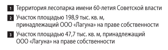 Часть своих убытков «Лагуна» связывает с подготовкой участков в лесопарке 60-летия Советской власти к застройке. «Приобретая земельные участки с видом разрешенного использования под строительство многоквартирных домов свыше трех этажей в зоне Ц-3 согласно действовавшей карте правового зонирования, ООО «Лагуна» рассчитывало осуществлять предпринимательскую деятельность в установленном законом порядке путем строительства жилых домов», — отмечается в заявлении.