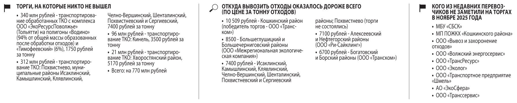 На момент подготовки в печать данного номера «СО» победители большинства подрядов раскрыты не были. Однако, как удалось выяснить изданию, среди них есть новые (преимущественно самарские) участники торгов, получившие в основном пока не очень большие подряды. А самые крупные контракты выиграли те, кто работал в Самарской области на мусорных перевозках еще до смены регоператора осенью 2024 года с ООО «ЭкоСтройРесурс».