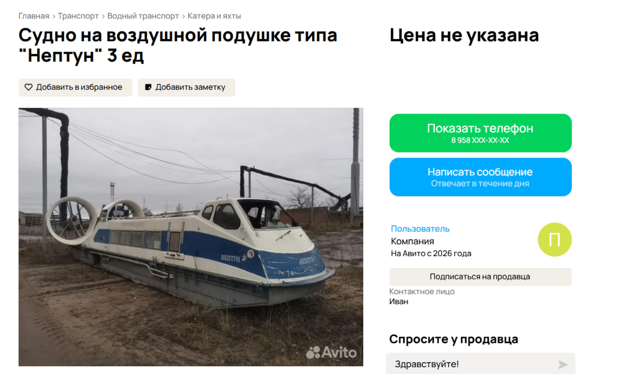 Региональное министерство транспорта прокомментировало нетривиальную, на первый взгляд, ситуацию: на популярной площадке Avito выставлены на продажу три судна на воздушной подушке «Нептун».