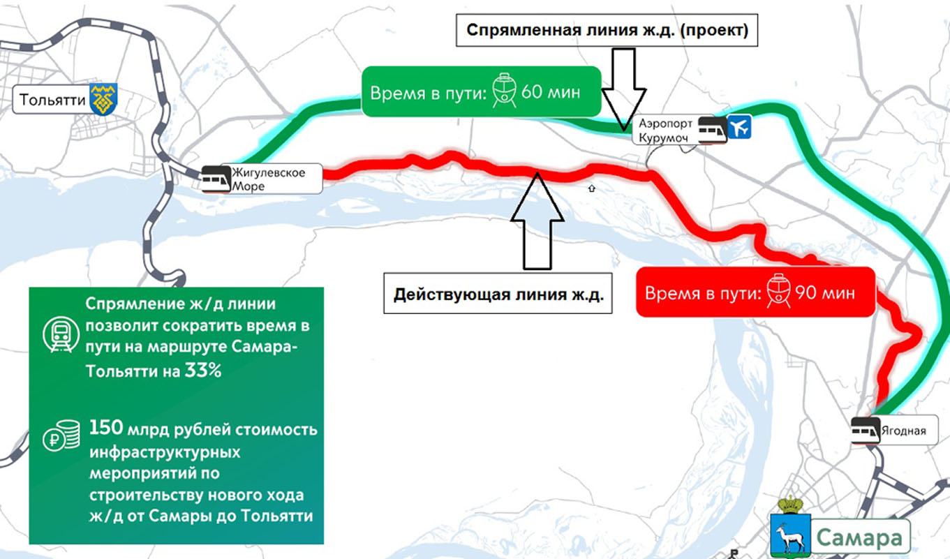 Решение? «Спрямление» железнодорожной линии над данном участке. Тогда время в пути сократится на треть и станет доступен аэропорт Курумоч.