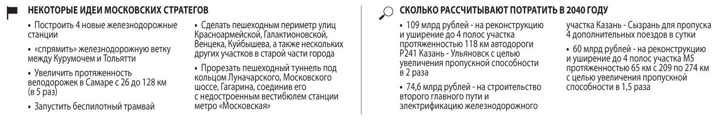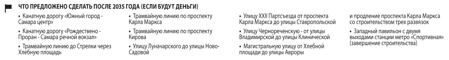 В числе мероприятий, которые откладываются на перспективу, — строительство в Самаре канатной дороги, один маршрут которой связал бы Южный город и центр Самары, другой — Рождествено, Проран и речной вокзал. Причем даже в такие сроки их предлагается реализовать только «при наличии дополнительных источников финансирования». На тот же период отнесено и строительство трамвайной ветки по улице (или все-таки проспекту?) Карла Маркса, при том что тот же документ убеждает, что если по этой магистрали пойдет общественный транспорт, то не потребуется строить новую линию метро.