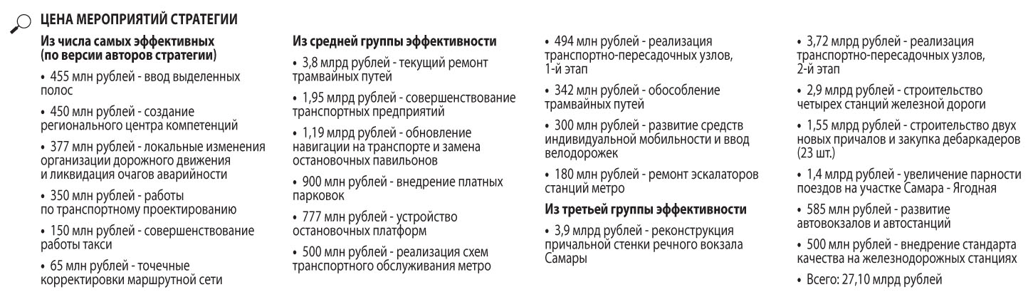 «Быстрые победы» на этом направлении должен обеспечить ремонт инфраструктуры там, где наблюдались сходы трамваев, обособление путей и устройство платформ. И решить эту проблему также предлагается с помощью столицы. А именно — рассмотреть передачу рельсов от ГУП «Московский метрополитен». Судя по написанному в стратегии, стоимость того, что для ГУП «Московский метрополитен» является металлоломом, оценивается в 400 млн рублей, на доставку в Самару потребуется еще 100 млн.