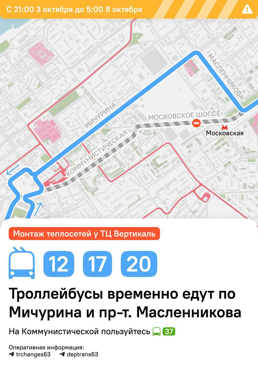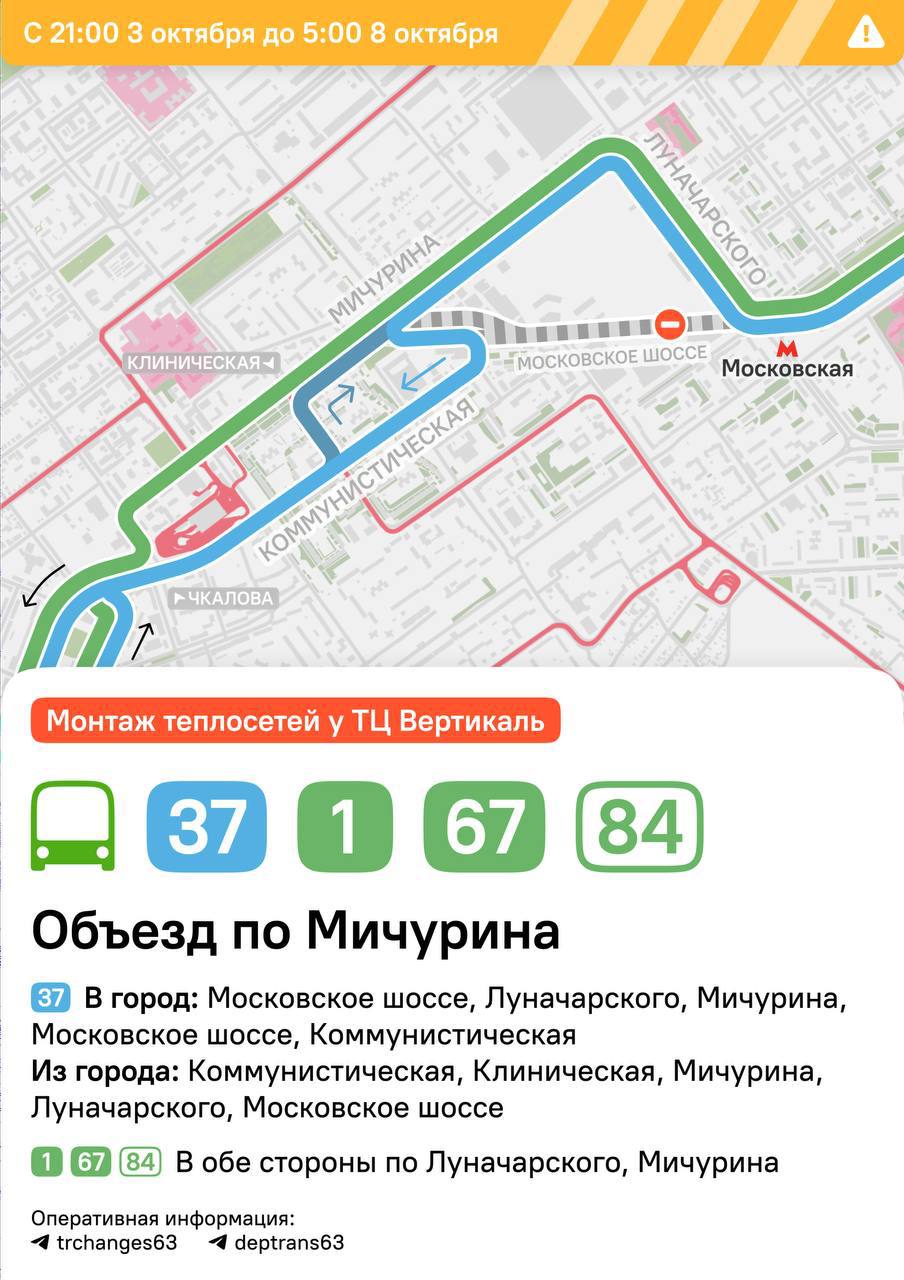 Ранее Минтранс Самарской области предупреждал автомобилистов и пассажиров общественного транспорта, что Московское шоссе будет закрыто на участке в районе БЦ «Вертикаль», неподалеку от кольцевой развязки Московское шоссе/улица Луначарского/улица Гагарина, с 21:00 пятницы, 3 октября, до 06:00 понедельника, 6 октября.