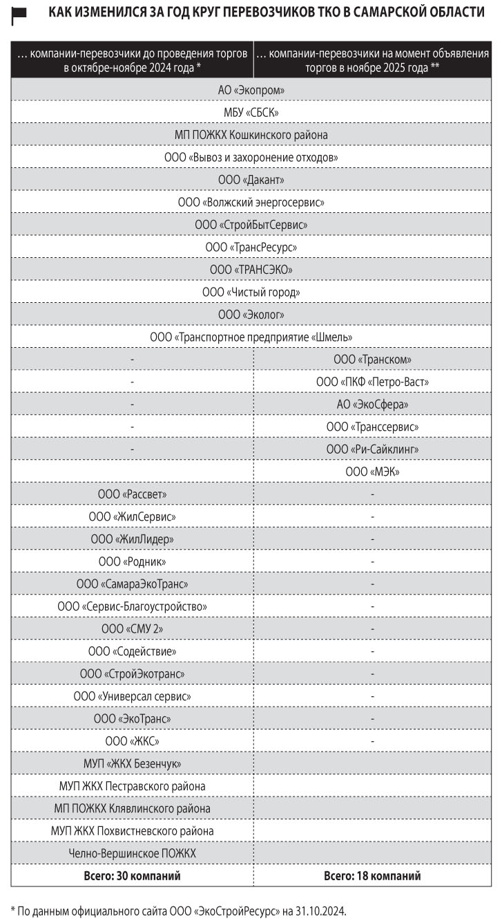 В результате пул из трех десятков компаний, которые работали на мусорных перевозках в Самарской области в середине 2024 года, за год сократился почти вдвое. В ответе АО «Экология» на запрос «СО» перечислено уже только 18 организаций, транспортирующих ТКО (не считая самой «Экологии»).
