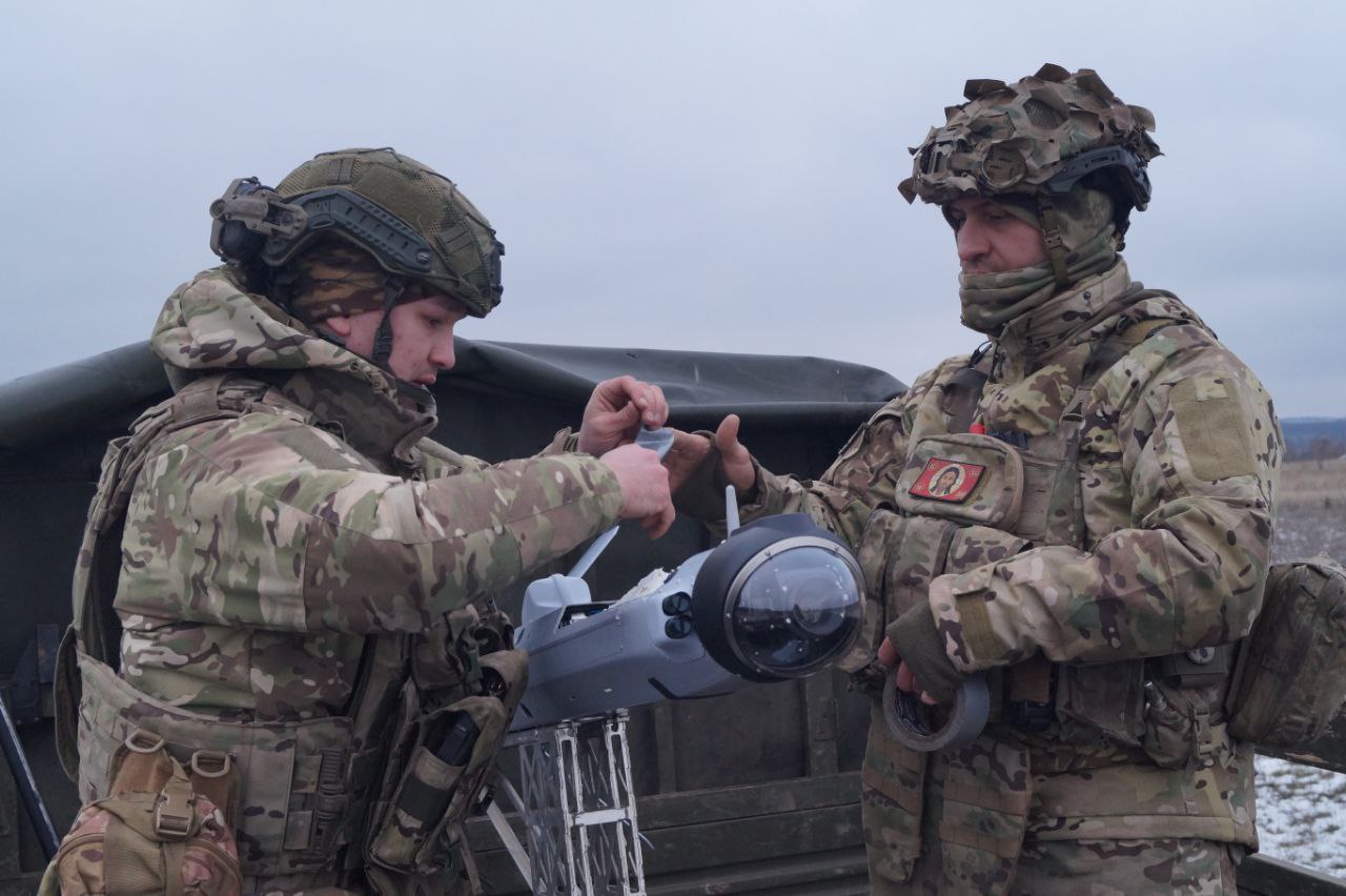 Спешившись с техники, военнослужащие приступают к предполетной подготовке. Водитель помогает товарищам раскрыть и сбросить тент с грузового автомобиля, открывая замаскированную пневматическую катапульту. Номер расчета подсоединяет газовый баллон к установке. Не теряя времени, гвардии ефрейтор Артем Егоров достает из защитного ящика беспилотник и начинает его сборку. К фюзеляжу он подсоединяет Х-образные крылья и устанавливает аккумуляторную батарею.