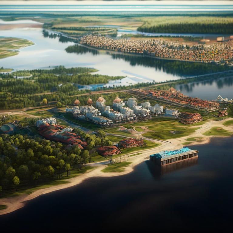 Генерированные нейросетью изображения демонстрируют, что ИИ видит будущее самарского туризма в освоении многочисленных островов на Волге небольшими эко-курортами.