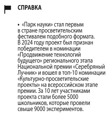 Юбилейный фестиваль «Парк науки» собрал рекордное число участников — около 500 детей и подростков из Новокуйбышевска и Самары. Самые младшие исследователи проводили эксперименты в химических лабораториях, школьники среднего и старшего звена на мастер-классах знакомились с электроникой, робототехникой, 3D- и беспилотными технологиями, создавали собственные проекты.