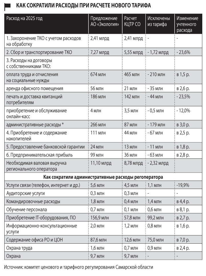 При этом регоператору все равно срезали существенную часть заявленных им было расходов, указав на неподтвержденность экономической обоснованности этих трат. В общей сложности в расчетах АО «Экология» необходимая валовая выручка составила 11,1 млрд рублей, а конечный тариф должен был составить 999,26 рубля. В этом случае рост тарифа составил бы +71%. Комитет сократил расходы на 2,32 млрд — до 8,78 млрд рублей. На основании именно этого расчета тариф сократился (относительно запрошенного командой главы «Экологии» Андрея Шестакова, относительно предыдущего, напомним, он резко увеличился) до 790,1 рубля, рост составил «только» 35%.