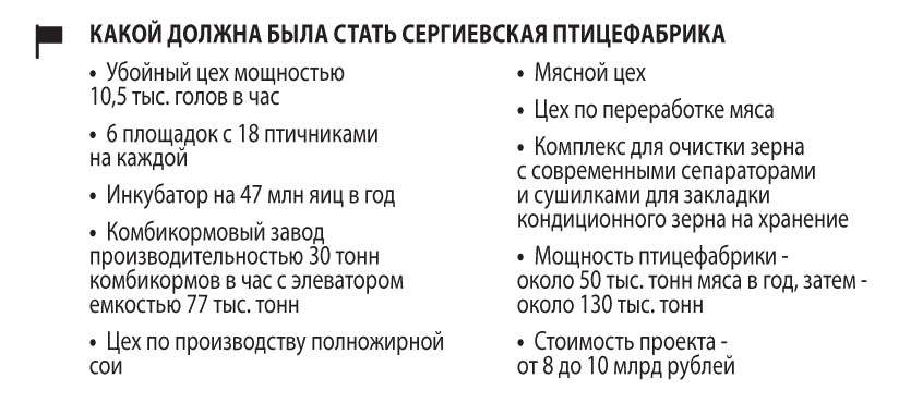 Планы строительства Сергиевской птицефабрики обсуждались не один год, но реальное возведение комплекса стартовало только летом 2013 года, так как проект претерпел большие изменения. Изначально планировалось, что финансирование масштабной стройки составит 8 млрд рублей. Планы были грандиозные: заявлялось, что вначале Сергиевская птицефабрика станет давать 50 тысяч тонн продукции ежегодно (что немногим больше всей потребности Самарской области в курином мясе), а к 2018 году ее производительность вырастет до 100-130 тысяч тонн в год. Комплекс должен был состоять из инкубатора, птичников для откорма бройлеров и убойного цеха. Но в связи с увеличением мощностей комплекса и добавлением в проект новых производств — завода по переработке сои и цеха по переработке мяса — смета проекта выросла до 10 млрд рублей. Еще одно изменение — рядом с цехом убоя должен был расположиться мясной цех, где планировалось готовить куриные деликатесы и колбасы. Таким образом, общая площадь производственных помещений выросла до почти 391 тыс. кв. метров. Также предполагалось, что к основным площадкам в Калиновке Сергиевского района (сама птицефабрика) и в Кабановке Кинель-Черкасского района (комбикормовый завод с элеватором) добавят земли с остановленными птицефабриками в Кротовке и Подбельске. Даже разрабатывался проект их реконструкции, однако эти площадки так и не вошли в проект.