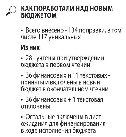 Фактически две трети поправок либо приняты сейчас, либо рекомендованы правительству к рассмотрению в процессе исполнения бюджета. Даже те поправки, которые были отклонены, остаются в поле зрения правительства и депутатов губернской думы.