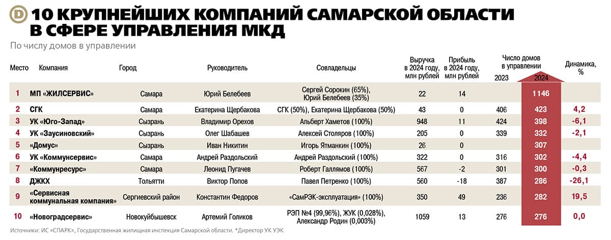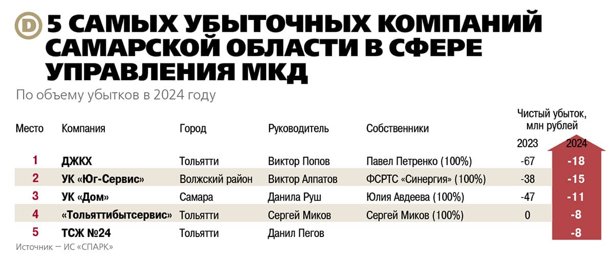 По итогам 2024 года тройку лидеров списка «ДЕЛА» покинул один из крупнейших игроков рынка управления МКД — тольяттинский ДЖКХ. Последние годы компания, входящая в империю Виктора Попова, стремительно теряла и в выручке, и в числе домов в управлении.