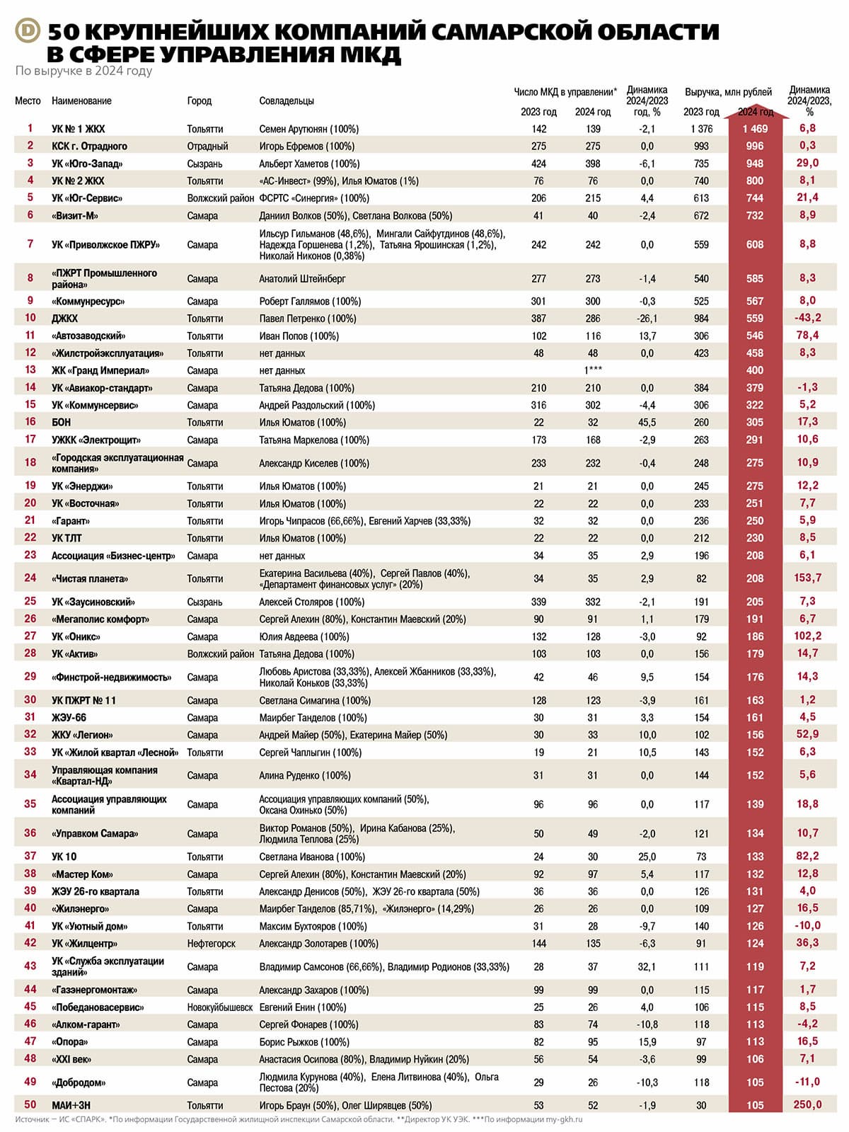 С 5-го на 3-е место поднялась сызранская УК «Юго-Запад» Альберта Хаметова. Компания нарастила выручку с 735 млн до 948 млн рублей. Динамика составила 29%. Прибыль также выросла — с 6,3 млн до 11,3 млн рублей. Росту сопутствовало сокращение числа домов в управлении. Их количество снизилось на 6,1% — с 424 до 398. Однако, судя по всему, это ничуть не помешало росту финансовых показателей.